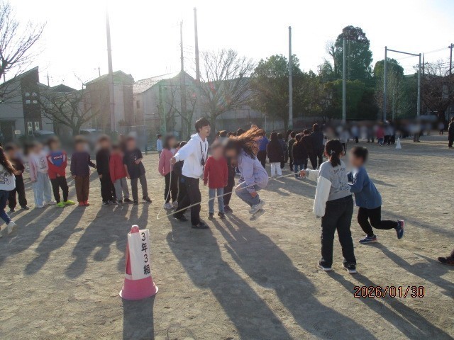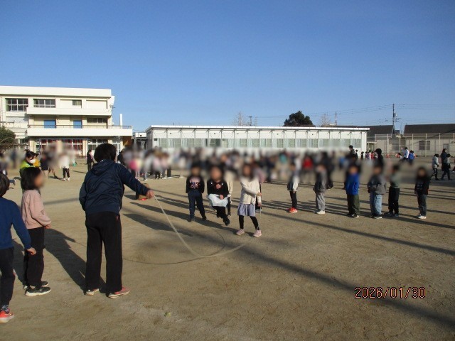 今日から長なわ期間が始まりました。 先週までの短なわ期間が終わり、今度はみんなで次々に跳ぶ長なわ跳びの楽しさが加わり、寒い朝でしたが笑顔が校庭にあふれていました。