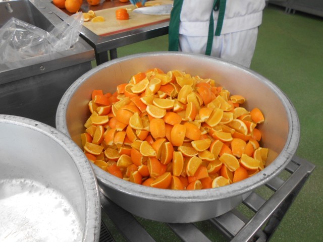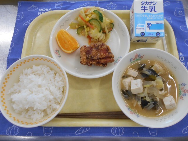 1月21日のメニュー…牛乳、ごはん、鶏のから揚げ、キャベツときゅうりのサラダ、わかめと豆腐のみそ汁、ネーブルオレンジ