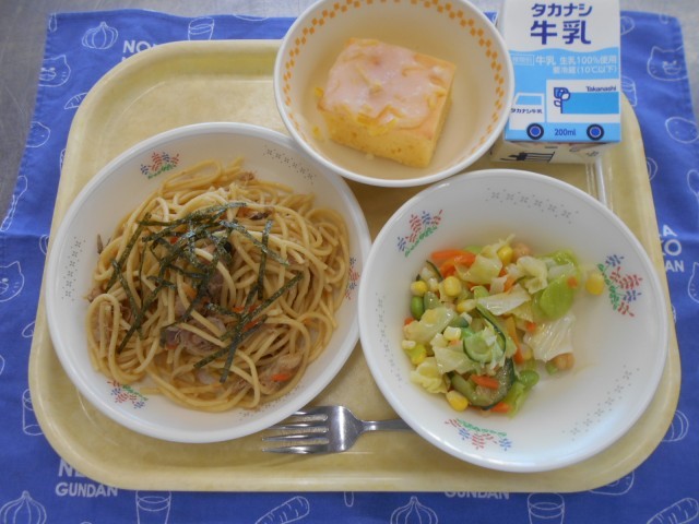 1月23日のメニュー…牛乳、ツナの和風スパゲティ、フレンチサラダ、成瀬小のレモンで米粉のレモンケーキ