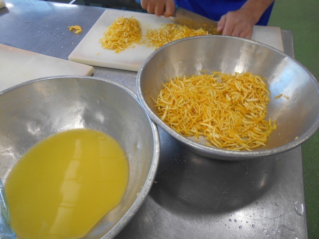 きょうは成瀬小にあるレモンの木に実ったレモンを使って「米粉のレモンケーキ」を作りました。成瀬小のレモンは「マイヤーレモン」の一種で、よく見かけるレモンと違って酸味がまろやかで、香りも華やかです。そのレモンを20個使い、レモン汁、レモンの皮を捨てることなく使います。レモンケーキは成瀬小で初登場のメニューです。米粉を使っているので、もっちりした仕上がりです。