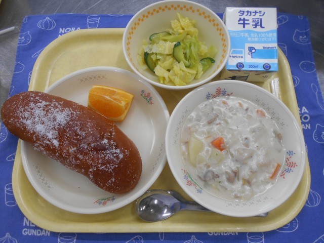 1月28日のメニュー…牛乳、揚げパン、コーンサラダ、麦入りシチュー、くだもの(いよかん)