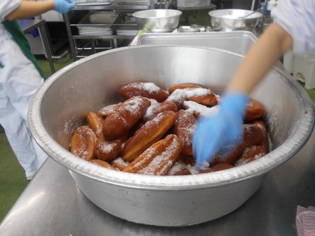 今日は昭和25年頃の給食を再現しました。戦争が終わり、アメリカから送られた小麦粉を使ったパン・ミルク・おかずのそろった「完全給食」が始まりました。そして、揚げパンが学校給食の定番となりました。