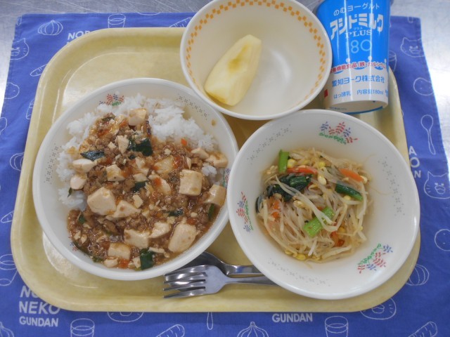 2月26日のメニュー…飲むヨーグルト、マーボー丼、和風はるさめサラダ、くだもの(りんご)