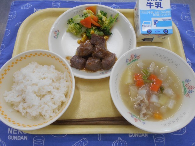 鹿児島産の和牛だそうです!和牛ならではの脂の甘みと、とろけるような食感を味わってください。お肉は、みなさんの血や肉を作る「赤色のグループ」の食べ物です。6年生はこの6年間、給食を食べて立派に成長した自分のお祝いとして、一口ひとくち大切にいただききましょう!