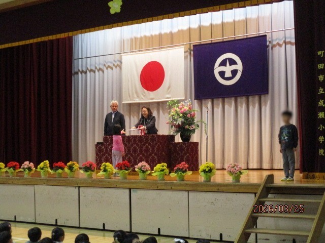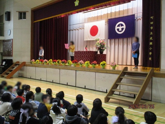 最初に校長先生から 「 今日の体育館は昨日の卒業式の雰囲気を感じてもらうために紅白幕、生花等を残してあります。 6年生が卒業して体育館が少しガランとしました。 成瀬小学校の最初の1年が終わります。 明日から春休みです4月にみんな元気に会いましょう。 春休み中の交通安全にはくれぐれも気を付けましょう、自分の命は自分でまもるのですよ。」 とお話がありました。 その後各学年各クラスの代表に終了証が渡されました。 終わりに最上級生となった5年生から児童代表の言葉がありました。
