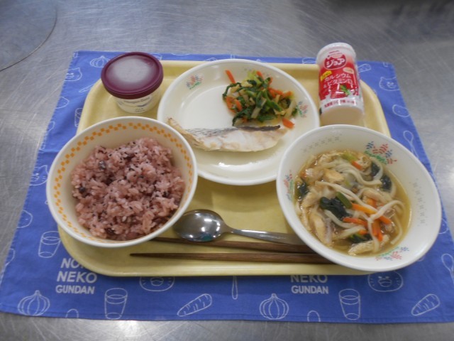今日は皆さんの卒業と進級をお祝いして、お赤飯や鯛の西京焼きなど、春を感じられるお祝い献立です。