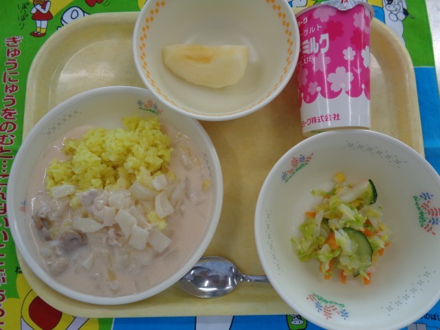 今日は春らしく、黄色いターメリックライスに、ピンク色のチキンクリームソースをかけました。とろみをつけるためのルーもすべて給食室で手作りしたものですよ。おいしくなるように、じっくり炒って作りました。ごはんにソースを絡めて食べてくださいね。サラダは、おろし玉ねぎも使用した手作りドレッシングで和えました。美味しいので野菜もしっかり食べましょう。