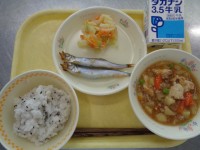4月9日のメニュー…牛乳、ごま塩ごはん、焼きししゃも、じゃがいものそぼろ煮、野菜...