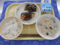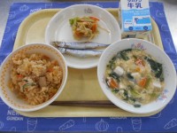 11月14日のメニュー…牛乳、キムチチャーハン、焼きししゃも、野菜の辛し和え、か...