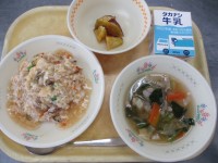 献立・あんかけチャーハン・中華スープ・大学いも・牛乳 チャーハンの上に、たまごと...
