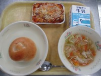 献立・ミルクパン・豆腐のミートグラタン・キャベツとレンズ豆のスープ・牛乳 「豆腐...