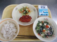 献立・麦ごはん・ヤンニョムチキン・チョレギサラダ・わかめスープ・牛乳 韓国料理の...