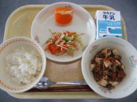 献立・きび入りごはん・ポテト入りナムル・マーボー豆腐・せとか・牛乳 今日の果物は...