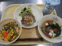 献立・わかめごはん・鶏のから揚げ・じゃこ入りおひたし・こづゆ・牛乳 明日で、東日...