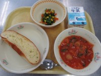 献立・ガーリックトースト・青菜とコーンのソテー・トマトと豆乳のパスタスープ・牛乳...