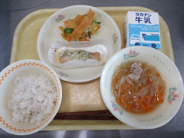 9月26日(金)の給食 公開日 2025/09/26 更新日 2025/09/26 給食 献立・麦ごはん・魚の磯マヨネーズ焼き・パリパリサラダ・コンソメスープ・牛乳 今日の主菜は「魚の磯マヨネーズ焼き」です。魚は、白身魚のホキです。マヨネーズと青のりを混ぜたもので味をつけて、オーブンで焼きました。 「パリパリサラダ」には、油で揚げたワンタンの皮を混ぜています。