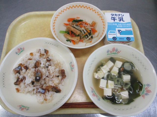 10月22日(水)の給食 公開日 2025/10/22 更新日 2025/10/22 給食 献立・さんまごはん・油揚げと野菜のおひたし・わかめスープ・牛乳 秋の味覚のひとつである、さんまを使った給食です。今日は、短冊切りのさんまに片栗粉をまぶして油で揚げ、ごはんに混ぜました。しょうゆやみりんで作ったタレを絡めて、蒲焼き風にしています。ご飯がすすむ味付けです。