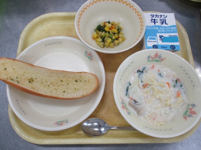 12月3日(水)の給食 公開日 2025/12/03 更新日 2025/12/03 給食 献立・ガーリックトースト・青菜とコーンのソテー・パスタとしめじのクリーム煮・牛乳 「ガーリックトースト」は、バターとガーリックパウダー、パセリを混ぜ合わせたものをパンに塗って焼きました。パンは、コッペパンを半分に切って使用しています。