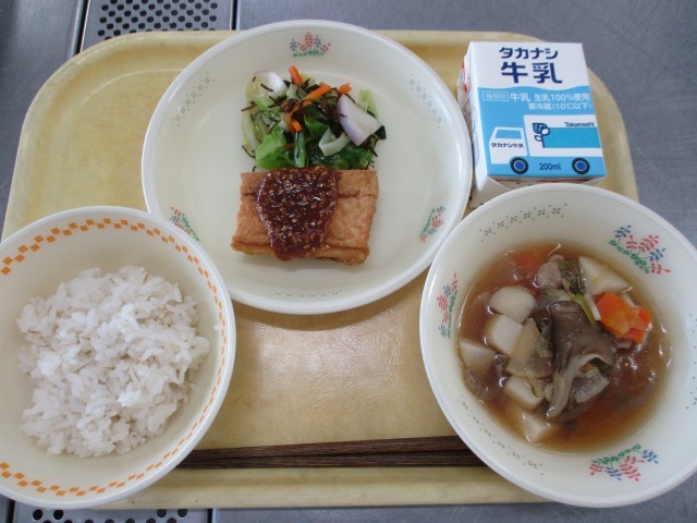 12月4日(木)の給食 公開日 2025/12/04 更新日 2025/12/04 給食 献立・麦ごはん・厚揚げのごまみそ焼き・青菜とキャベツのこんぶ和え・いもっこ汁・牛乳 「こんぶ和え」のかぶは、近隣農家の方が届けてくださいました。今日の小松菜やキャベツ、だいこん、ねぎも町田市内で収穫された野菜です。
