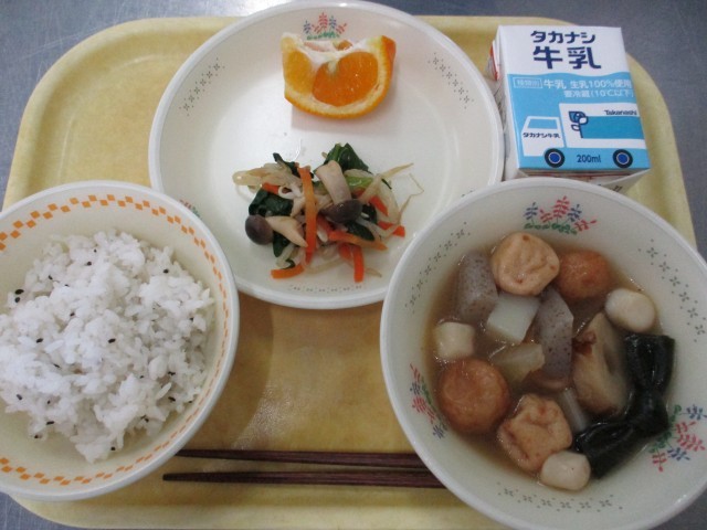 1月21日(水)の給食 公開日 2026/01/21 更新日 2026/01/21 給食 献立・ごま塩ごはん・青菜ときのこのおひたし・おでん・いよかん・牛乳 「おでん」の給食です。じゃがいも・大根・こんにゃく・こんぶ・ちくわ・揚げボール・はんぺん・がんもどきの8種類の具材を使いました。かつお節と昆布で取っただしや、しょうゆなどの調味料で煮て作っています。