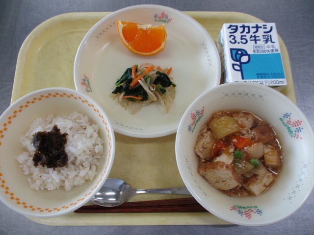 新じゃが、鶏ひき肉、玉ねぎ、にんじん、生揚げなどを、しょうゆやだしなどの調味料で煮込みました。