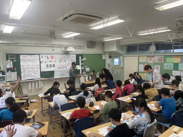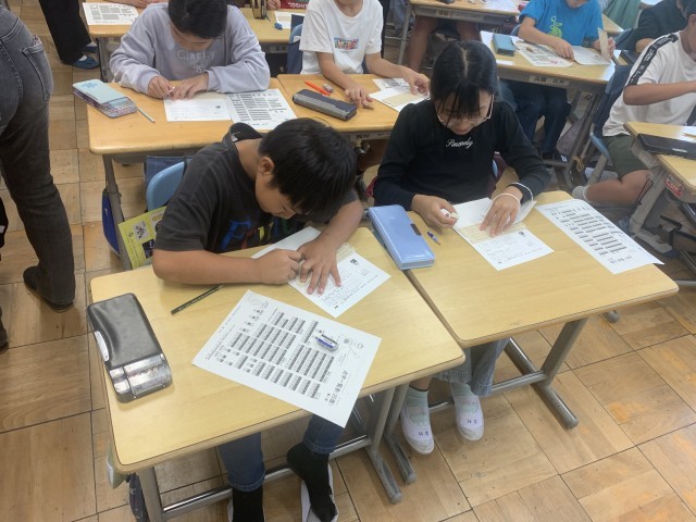 今日は4年生が「勝川壬雄福祉体験授業プロジェクトチーム」の皆様のご協力をいただき、点字体験をしています。自分の名前などを、実際に点字で表している場面です。様々な福祉体験が、将来に繋がることを願っています。