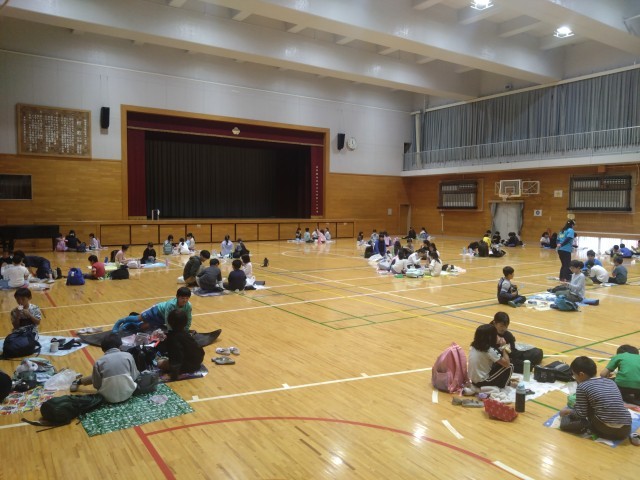 今日予定していた4年生の遠足は延期になりました。そこでみんな仲良く体育館でお弁当です。延期は残念でしたが、美味しいお弁当を食べていい表情をしていました。遠足の延期日は11月7日(金)です。次回こそは遠足行くぞ!いい天気になぁれ。