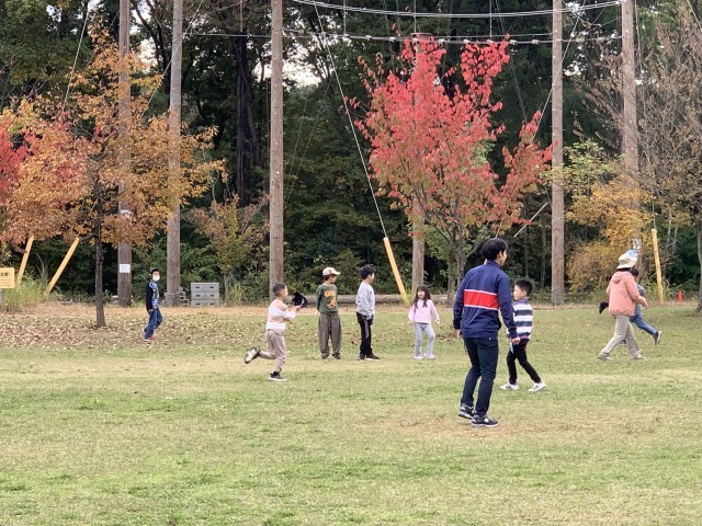 二日目は、バイキングの朝食、そして大きな広場で鬼ごっこをしました。そのあとは写真の遊具で楽しみました。秋探しをする子もいて、秋らしい天気のもと充実した時間を過ごすことが出来ました。