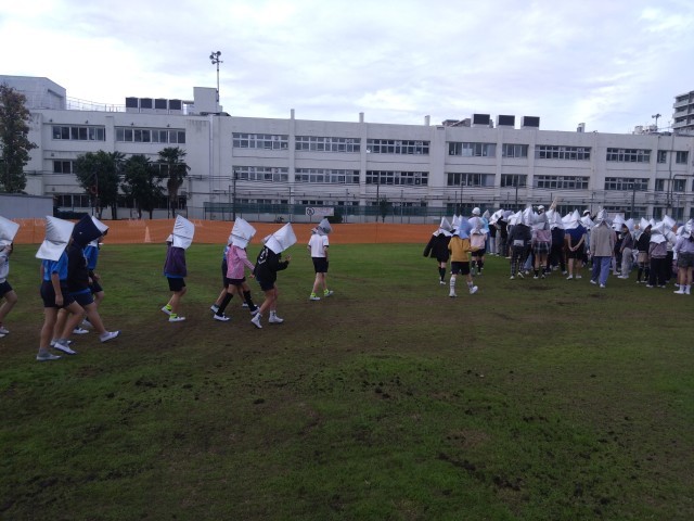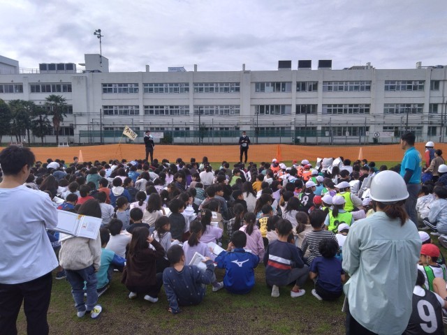 今日の避難訓練は校庭にいると危険性があるため第2避難場所(シバヒロ)に避難する想定で行いました。避難訓練は毎月1回必ず行っています。非常時に考えて行動できる力を高めていきます。