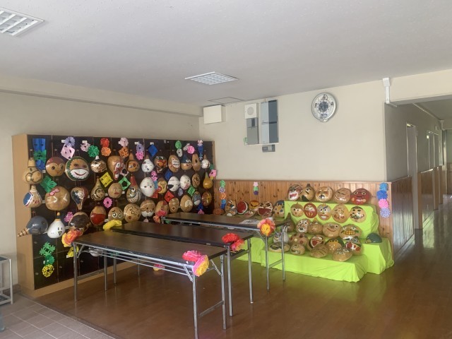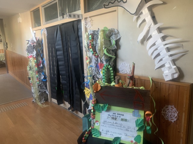作品展の作品が、だいぶ飾られてきました。写真の「ふくべざいく」は6年生が日光移動教室で作製したものです。ふくべざいくは栃木県の伝統的な工芸品でユウガオの実を使って作っています。もう一枚の写真はブラックライトルーム。どんな部屋になるか楽しみです!