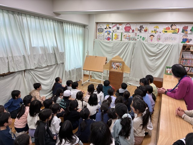 今日の中休みに読み聞かせがありました。「山のみんなのおもちつき」という紙芝居を見せていただきました。引き込まれる内容でした。そのあと、短い本の読み聞かせ。子どもたちは楽しそうに聞き入っていました。