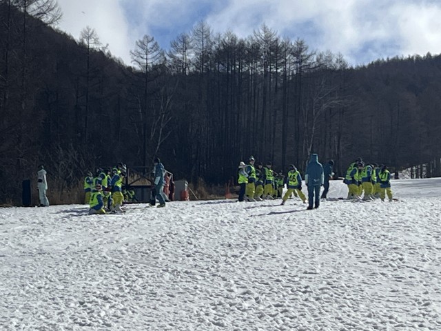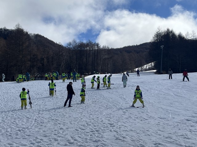 青空の下、スキースクール2日目がスタートしました。昨日よりも滑る距離を長くして練習をしています。早速リフトに乗って上から滑ってくるグループもいます。