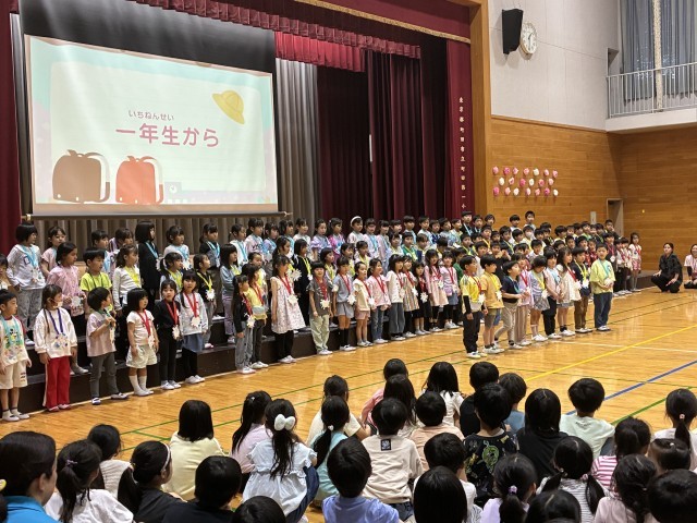 一年生をむかえる会がありました。ニ年生からすてきなプレゼント。全体で校歌を歌いました。そして一年生から、歌を聞かせてもらいました。明日からは校庭で、いっしょに遊ぶことになります。いよいよ小学校生活が本格的になってきました!