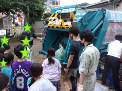 中身が見えるごみ収集車「みえるくん」も登場し、クラスの代表さん達が実際にごみ入れ体験もしました。