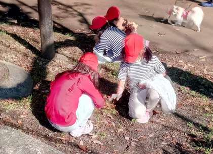 青空のもと、1年生が生活科見学に芹が谷公園にきました。どんぐりを見つけたり、大きなクロアゲハを見つけたりと、秋深まる季節の観察をしました。
