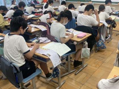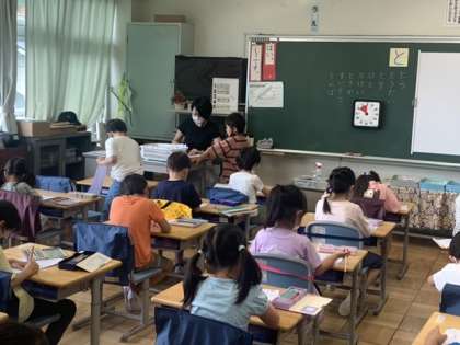 今日は一年生が遠足に出かける予定の日でしたが、残念ながら延期となりました。雨は止んでくると予報からわかっていましたが、何しろ楽しみにしている滑り台が使えません。昨夜の段階で延期を決定しました。写真は、そんな中でも子どもたちが頑張って勉強をしている場面です。一年生、一カ月でだいぶ成長しました。