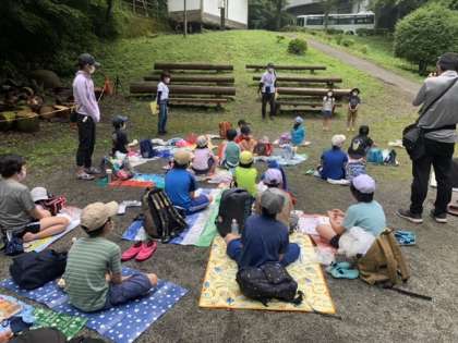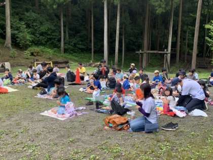 お昼ごはんを食べています。自然の中でのお弁当、子どもたち幸せそうです。しっかり食べて、これから沢遊びに向かいます!