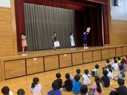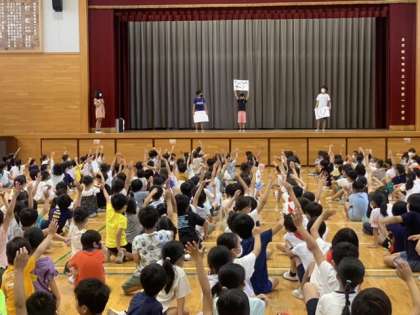 短い梅雨となった6月、最後の日です。今日もとても暑くなりました。今朝は体育館でゲーム集会を行いました。イントロ当てクイズを全校で楽しみました。体育館にクーラーが入るようになり、このような集会も行いやすくなりました。今日も一日熱中症に気をつけて過ごしたいと考えます。