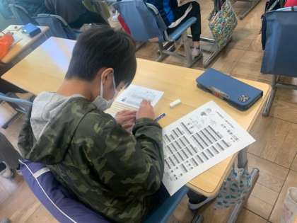 4年生が、点字体験をしました。実際に点字を打ってみました。自分の名前を点字にしたのです。その前に、点字の役割だけでなく障がいのある方々とどう触れ合っていけばよいか、大切なお話しをいただきました。とてもよい学びになったと考えます。