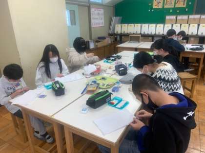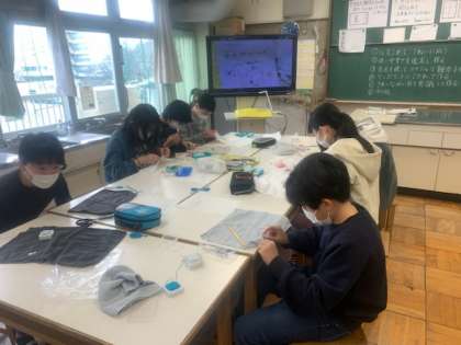 家庭科の授業で6年生が雑巾を作っています。使わなくなったタオルをリメイクして、雑巾にします。そういった活動の積み重ねが、持続可能な社会に繋がっていくという、極めて大きな目標に繋がっています。一枚は学校に寄付。卒業生としての活動です。