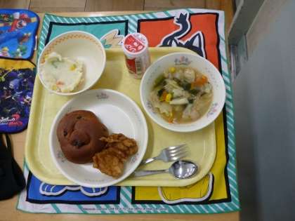 2年生の教室にお邪魔して、配膳された給食の写真を撮らせていただきました。