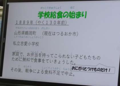 給食の歴史や給食が開始されてからのメニューの移り変わりなど、写真を使ってとても分かりやすく説明をしてくれました。