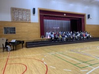 今日はかなりの雨。休み時間は当然外で遊べません。そんな中、休み時間に保護者のみなさんによる読み聞かせがありました。中休みと昼休みの両方で行われましたが、写真は昼休みの様子です。ニュースのような演出、そして紙芝居に子どもたちは喜んで聞き入っていました。