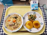 献立:なすと町田トマトのスパゲッティ、コーンサラダ、わかったさんのスイートポテト...