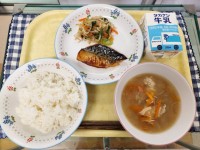 献立:ごはん、焼き魚、鶏団子のみそ汁、おかか和え、牛乳です。