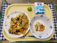 献立:秋野菜のカレーライス、町田のトマトドレッシングサラダ、シャインマスカット、...