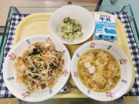 献立:ビビンバ、青のりポテト、たまごスープ、牛乳です。