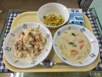 献立:カレーうどん、梅肉和え、焼きみそおにぎり、シャインマスカット、牛乳です。