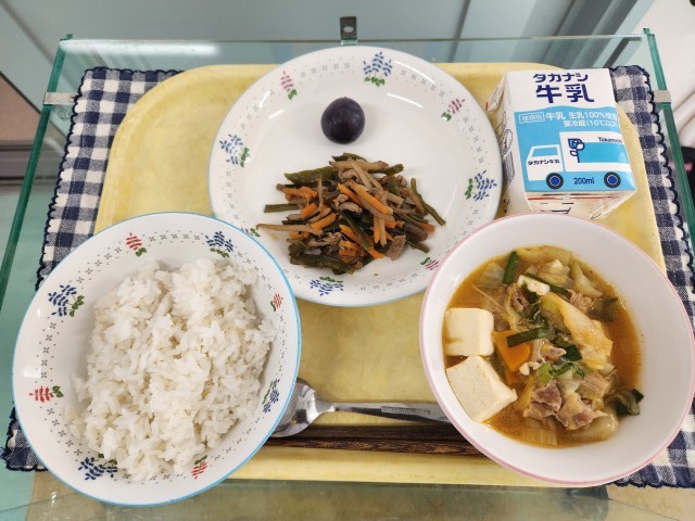 献立:麦ごはん、キムチ豆腐、くきわかめのきんぴら、巨峰、牛乳です。