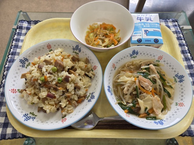 献立:メンマ入り町田の焼豚チャーハン、ワンタンスープ、中華和え、牛乳です。